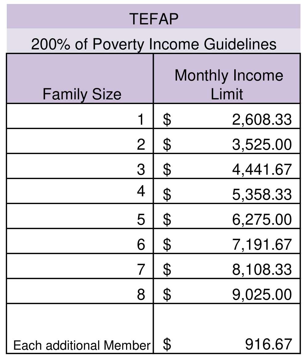 Day old bakery items are picked up daily at area stores and distributed. Participants receive bakery products with their food box and can come into the office once a week for bakery when available. Garden produce are also distributed through this program when available and storage is possible.